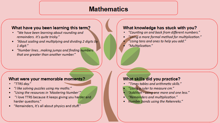 - Cross-Curricular Maths – Many aspects of the curriculum, especially Measurement, Geometry and Statistics are taught through our wider curriculum enquiry question approach. There are particularly strong links with Computing, Science, Geography and Outdoor Learning.